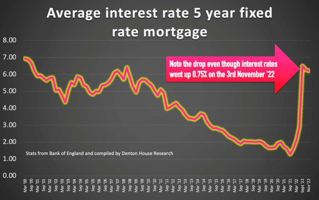 Yet even though the Bank of England increased the base rate by 0.75% on the 3rd of November, the average 5-year fixed rate mortgage dropped by 0.22% between the 3rd week in October and bonfire night. As interest rates go up, mortgage rates are coming down even though interest rates are projected to increase to 4.5% by the autumn of 2023.