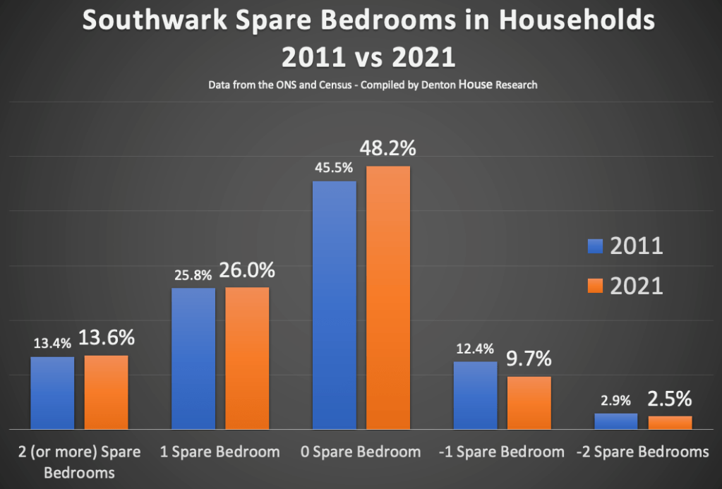 The number of Southwark households living in properties with at least two spare bedrooms (i.e. spare ‘spare’ bedrooms) increased by 1,703, from 16,077 households to 17,780 households between those ten years.