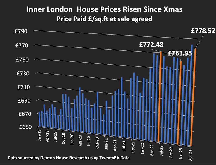 By this April, the average £/sq. ft achieved for all house sales agreed in Inner London had risen by 2.13% to £778.52/sq. ft.