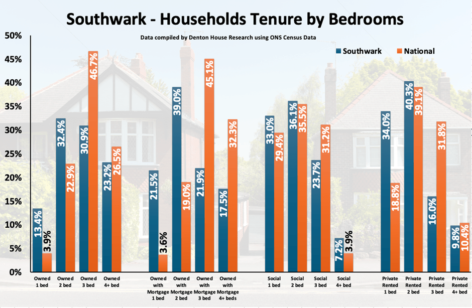 - 37.52% of Southwark homes are 2 bed households, compared to 27.1% nationally.