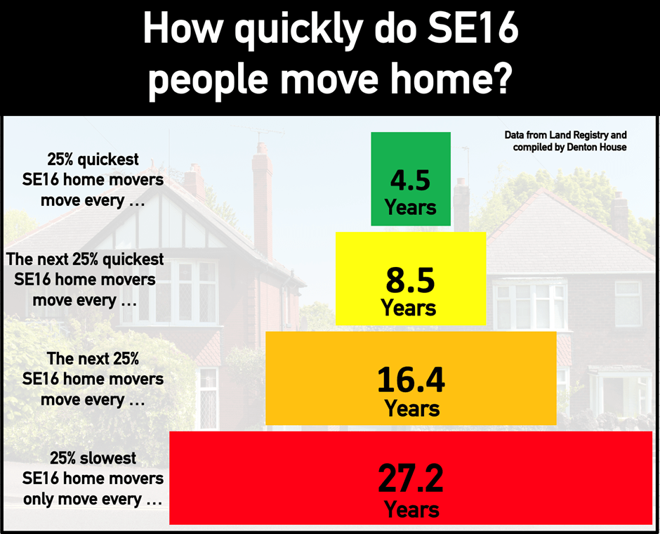 - The quickest 25% of SE16 home movers (i.e. 1st to 10th) moves every 4 years & 26 weeks – that’s a quick move!