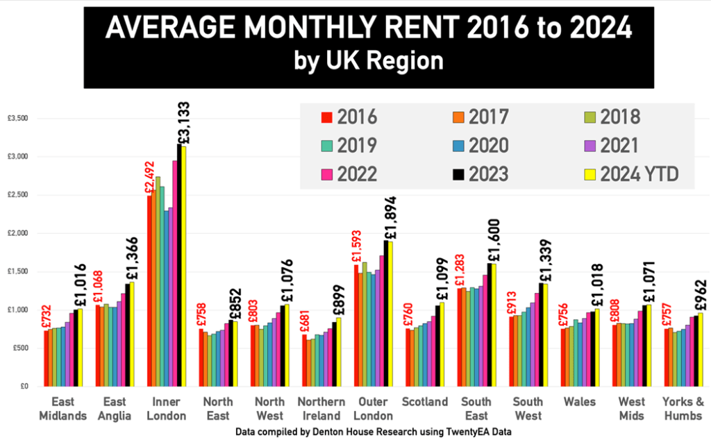 In Inner London for example, the average rent has risen from £2,492 per calendar month (PCM) to £3,133pcm YTD in 2024.