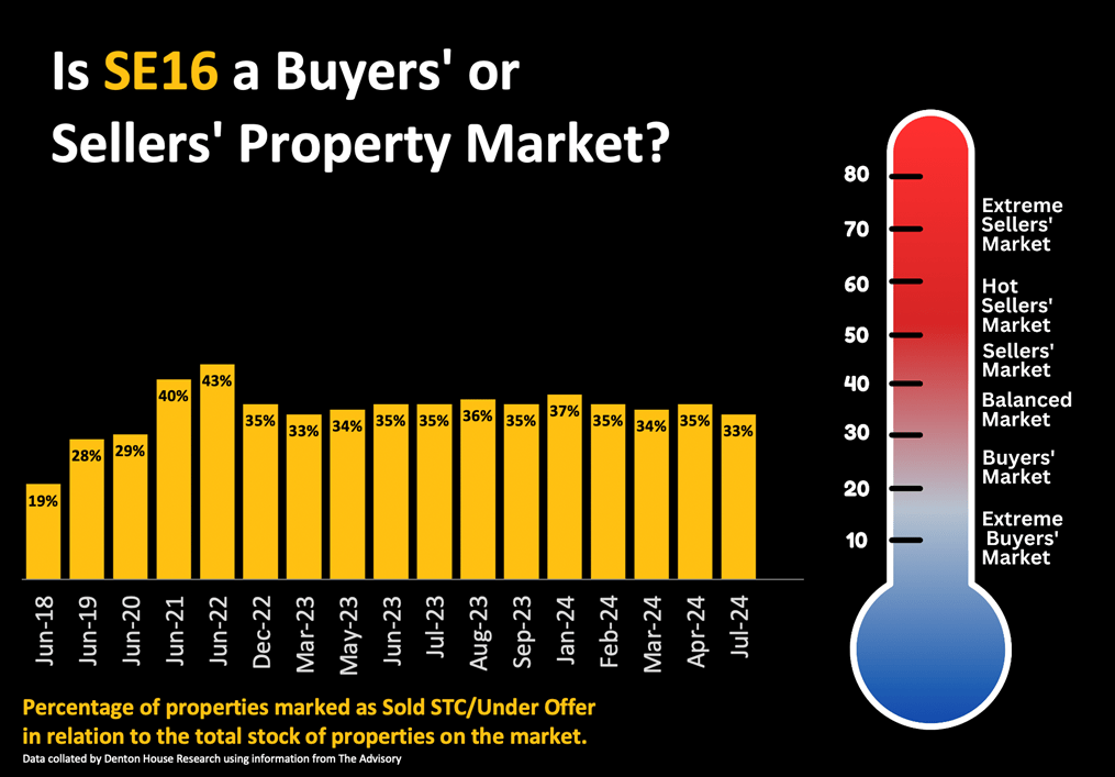 - Throughout 2023, the SE16 property market was in the 30% range (a balanced market).