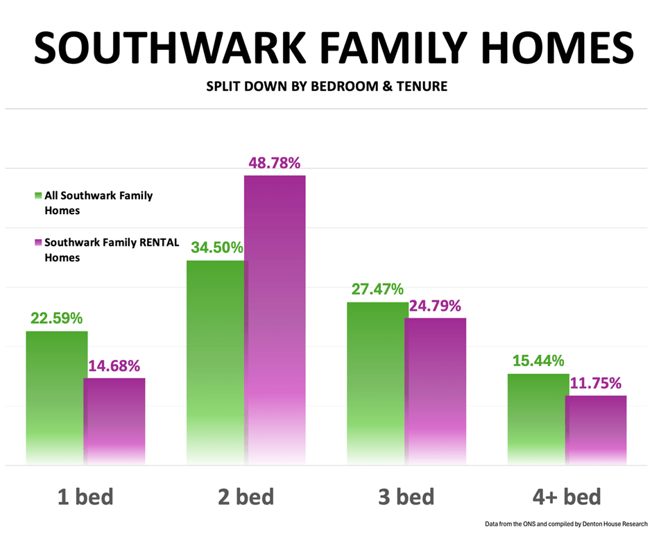 - 34.50% of Southwark homes occupied by families have 2 bedrooms