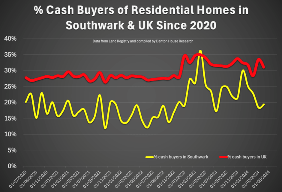 - In 2024 YTD, 33.26% of UK home buyers were cash buyers, whilst in Southwark, 21.4% of buyers were cash buyers.
