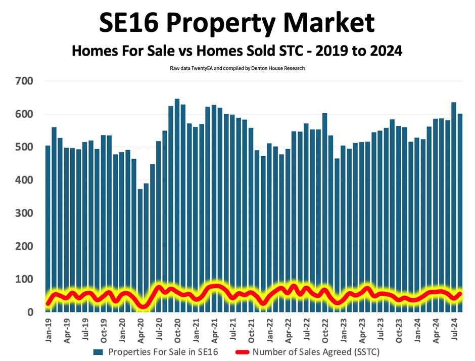 Since January 2024, the number of SE16 homes selling has been at an average of 53 homes sales per month, yet here is a fly in the ointment: the number of homes for sale has steadily risen to 601 in August 2024 alone.