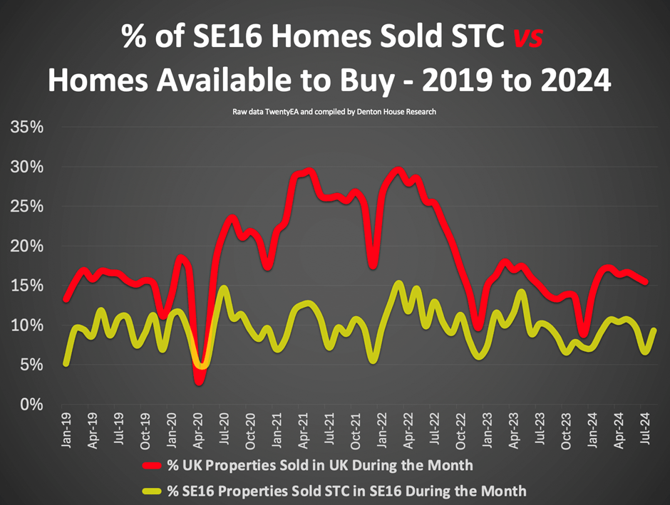 The yellow line on the graph represents the percentage of SE16 properties sold SSTC during the month as a proportion of the homes for sale, while the red line for interest shows the equivalent figure for the entire UK.