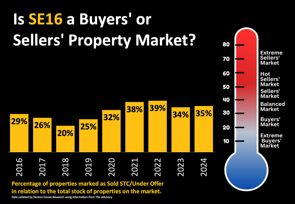 As is expected, it was a stronger market for SE16 sellers in the post Covid years, yet things have settled down now to levels seen before the pandemic, this current percentage of 35% puts us right in the middle of a balanced market.