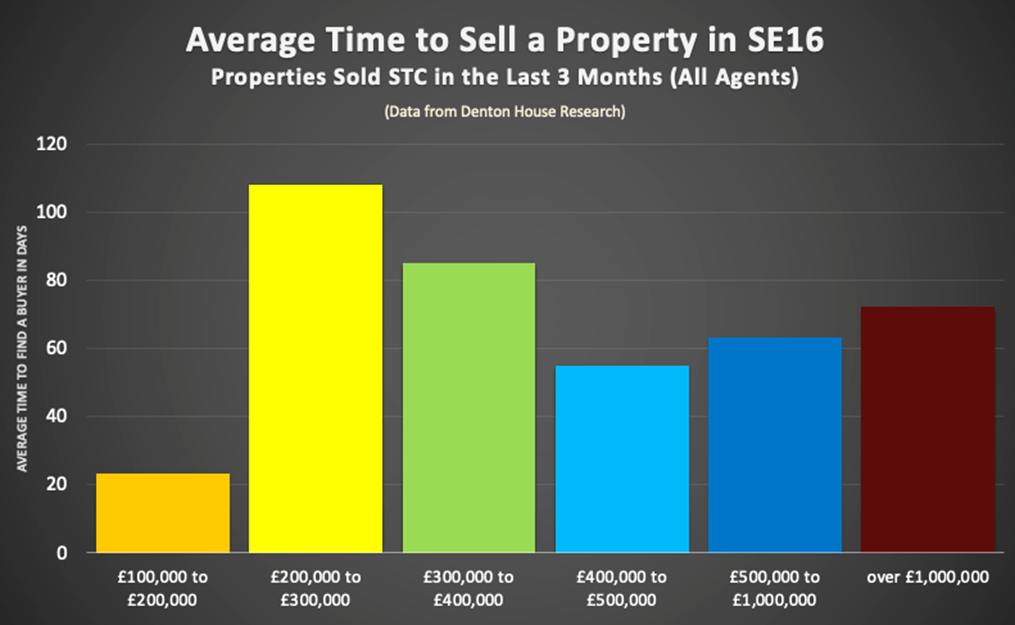 Reflecting on this independent research—which focuses exclusively on SE16—it’s fascinating to observe how these different price segments (or micro-markets) are currently performing when we look at the average time it takes to secure a buyer in the SE16 area. The average time to find a buyer in the last 3 months in SE16 for those properties that have agreed a sale on them is as