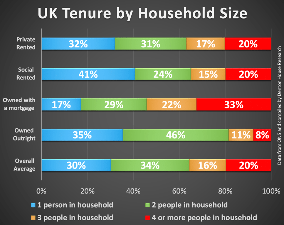 Interestingly, those living alone are more likely to occupy council housing, with 41% of single-occupant households falling into this category. On the other hand, the largest households – those with four or more people – are typically homeowners with a mortgage. This makes sense, as larger families often require financial support to purchase a home.