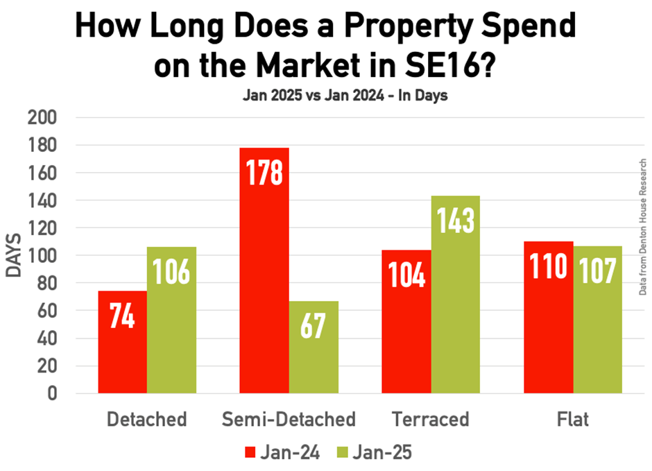 - Terraced/Town Houses in SE16 – Average time on the market today is 143 days, compared to 104 days in Jan 2024.
