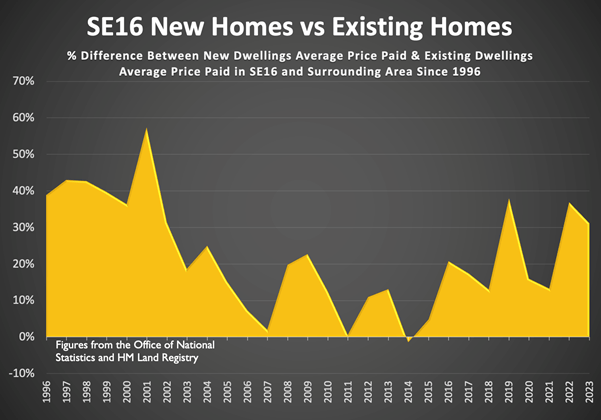 Looking at the average price paid for existing (second-hand) homes versus new build properties in SE16 and the wider Southwark London Borough since 1996, a clear trend emerges: new build homes command a significant premium.
