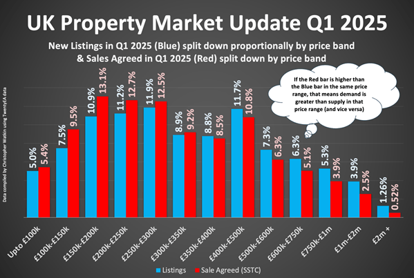 - 13.7% of the properties that came on the market in Q1 2025 were in the £500k to £750k price band, yet only 11.3% of the home sales (SSTC) were in this band.