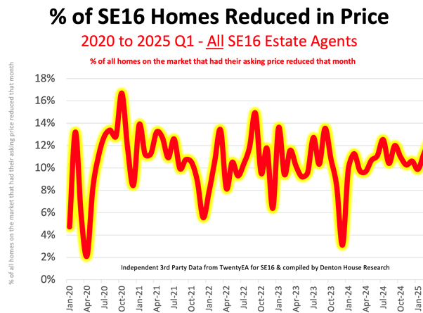 - An average 11.2% of the 654 properties typically for sale each month in SE16 Q1 2025, reduced their asking prices.