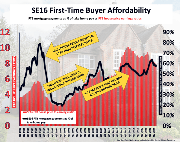 In the graph—the red bars represent the first-time buyer HPER in SE16, while the black line shows first-time buyer mortgage payments as a percentage of take-home pay.