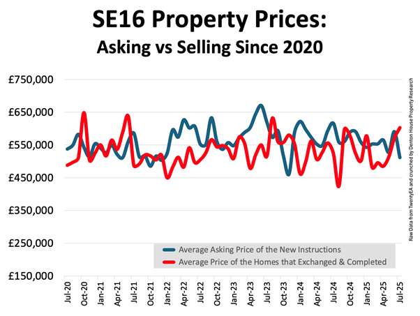 In 2025 so far, the average asking price of the homes coming onto the market in SE16 has been £549,200. But the average price of an SE16 home that’s actually sold and completed is £532,200. That’s a 3.2% difference.