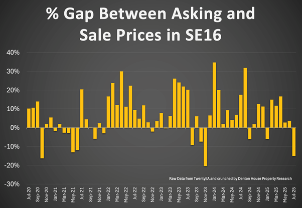 There is a growing gap in our area between what SE16 home sellers want and what buyers are actually willing to pay. And the evidence for this is laid out, month after month, in cold, hard numbers.